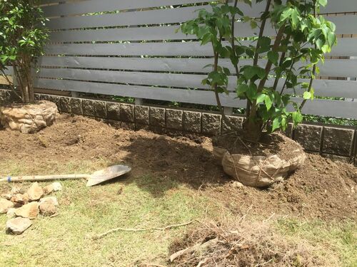 もともと植わっているキンモクセイとヤマボウシを堀上げて、周りにピンコロ石を使い花壇を造ります。 あらかじめ、仕上げる曲線に芝生をめくり、ピンコロ石をそれに合わせます。 けっこうな曲線でもピンコロ石を使うと自由に決められるのでレンガ積みと並ん…