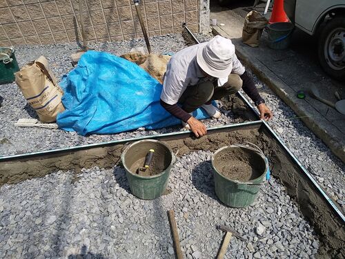 何とも言えないこのスペース、、、 鬼門ではありません。 何故か生垣の外にあり管理できないので、極力何もしたくないとの事で固まる土で仕上げます。 既存の砂利をいったんよけて除草します。 しっかり転圧したら固まる土を敷きならします。 厚みは5㎝ぐら…