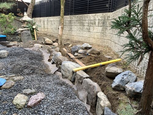 土留石なので大きい石だけを並べてもいいんだけど、細かい石もバランス良く並べるといい感じに見えるんです。 防草シートは隙間なく敷き詰めます。 それでも際からどうしても多少は草が出てくるんです、、、 雑草は本当に強いですよね、、、 砂利の厚みは防…