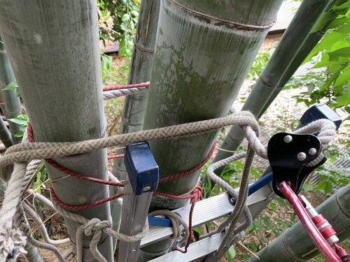 建物に倒れかけている竹を伐採してます。 竹はけっこう重たいんですよ。 地際で切って倒せたら早いのですが、建物が壊れてしまいますから、いろいろ工夫して伐採してます。 きっと下で作業してる方がキツイと思いますが、、、 下はお願いします。 先月にお手…