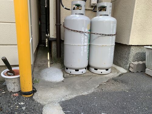 プロパンガスの地盤が低く水がたまるらしい。 土台を造り上げてほしいとのことです。 周りの住宅は大体ブロックを並べてモルタル補修。 植木屋ですから板石しか発想できませんでしたね、、、 仕事も早いし、当日中に元に戻せます。 水がたまらないように勾配…