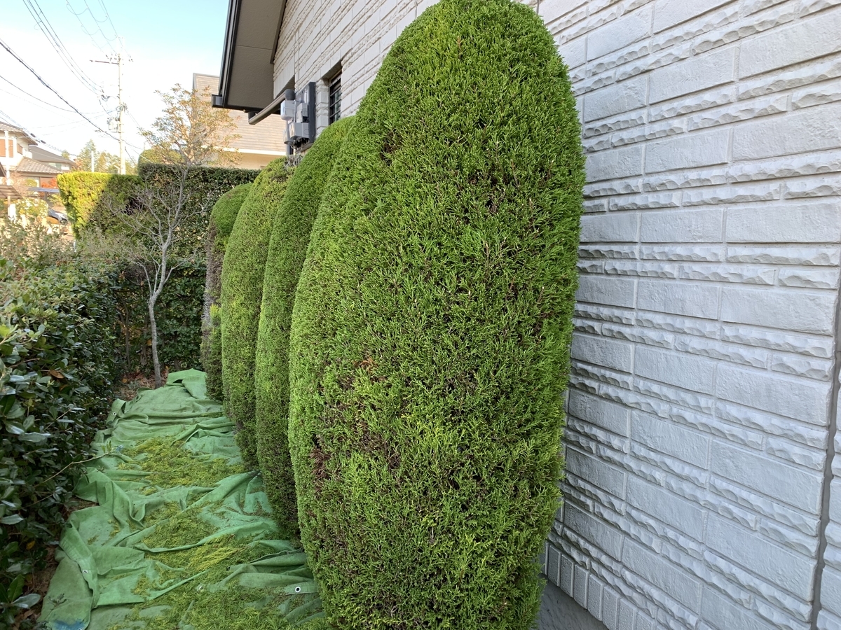 電気トリマーを使用するとこんなに綺麗に刈り込みができます。ゴールドクレストを両手鋏み刈り込むと時間もかかりますし、なかなかつるんと仕上げるのは難しいです。