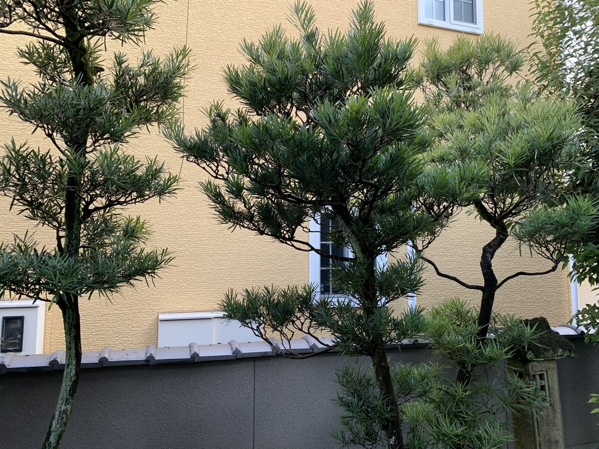 並んだイヌマキとラカンマキの葉むしり剪定です。一般の剪定に比べる薄目の剪定に仕上げます。