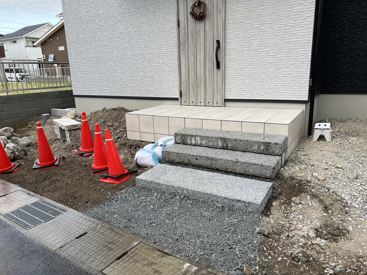 2023-07-28 外構工事 2 玄関ポーチは広い方が良いですよね。 もう少し広くとってもよかったのですが、これでいきましょう。 階段石は仕事が早いです。 もちろん重機を使用してですがね。 取り急ぎ、これでお引っ越しに間に合いました。 harutazouen.com